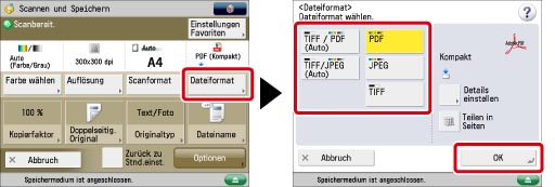 Speichert die Datei entweder im Format TIFF (Schwarzweiß) oder PDF (Graustufen/Farbe). Wenn Sie dieses Dateiformat wählen, wird <TIFF/PDF> auf dem Scandisplay angezeigt.