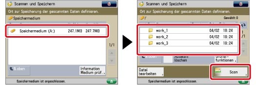 Wählen Sie das Speichermedium → Wählen Sie den Zielordner → Berühren Sie die Taste [Scan].
