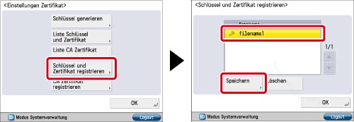 Berühren Sie die Taste [Schlüssel und Zertifikat registrieren] → Wählen Sie die zu registrierende Datei → Berühren Sie die Taste [Speichern].
