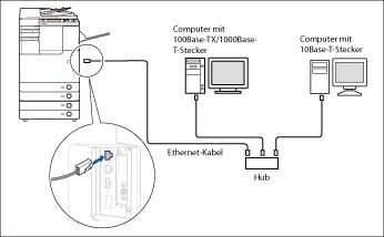 Wenn Ihr System in einer gemischten 10Base-T/100Base-TX/1000Base-T-Umgebung verwendet wird, müssen die Geräte im Netzwerk (Hubs, Router usw.) die gemischte Umgebung unterstützen. Nähere Informationen erhalten Sie bei Ihrem Canon-Vertriebspartner.