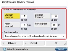 Für Bindery PServer berühren Sie [Weiter] → Definieren Sie die einzelnen Punkte bei Bedarf auf dem Display zum Definieren des Bindery PServers.