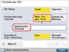 Wählen Sie [Manuelle Einstellungen] für <Algorithmus Auth./Verschlüss.> → Legen Sie den für IKE SA anzuwendenden Authentisierungs- und Verschlüsselungsalgorithmus fest → Bestätigen Sie durch Berühren der Taste [OK].