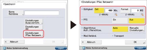 Berühren Sie die Taste [Einstellungen IPSec Netzwerk] → Legen Sie Dauer und Typ der SA-Prüfung sowie PFS (Perfect Forward Security) fest.
