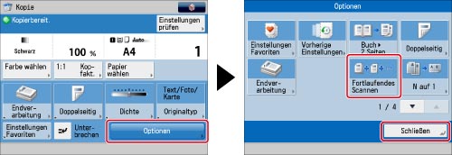 Sie können die unter [Einstellungen ändern] angezeigten Einstellungen nur ändern, wenn die Funktion <Fortlaufendes Scannen> aktiviert ist. Alle Kopier-/Scaneinstellungen müssen im voraus programmiert werden. Wenn Sie allerdings die Funktion <N auf 1> zusammen mit der Funktion <Fortlaufendes Scannen> aktivieren, können Sie die Einstellungen zum Originaltyp, zur Dichte und zum Farbmodus nicht verändern.