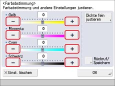 Um die Dichte der jeweiligen Farbe zu justieren, berühren Sie die Taste [Dichte fein justieren]. Wählen Sie die Farbe, die Sie justieren möchten → Verwenden Sie die Taste [-] oder [+], um die Dichte für dunkle (hoch), mittlere und hellere (niedrig) Bereiche zu justieren → Bestätigen Sie durch Berühren der Taste [OK].