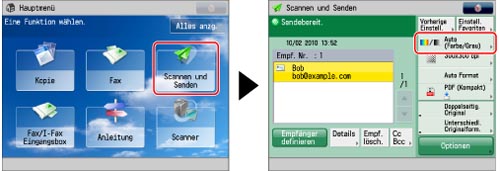Berühren Sie die Taste [Scannen und Senden] → Geben Sie den Empfänger an → Berühren Sie die Farbauswahltaste.