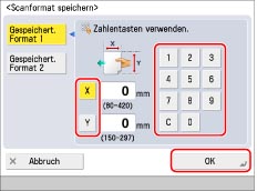 Berühren Sie die Tasten [X] oder [Y] → Geben Sie das Scanformat über die Zahlentasten ein → Bestätigen Sie durch Berühren der Taste [OK].