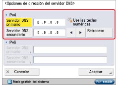Pulse [Servidor DNS primario] → introduzca la dirección IP. Pulse [Servidor DNS secundario] → introduzca la dirección IP.