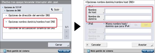 Pulse [Opciones nombre dominio/nombre host DNS] para [Opciones de DNS] → defina el [Nombre de host] y el [Nombre de dominio] de <IPv4>.