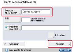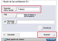 Pulse [Establecer buzón de fax/I-fax] → [Establecer/Guardar buzones fax confidencial].
