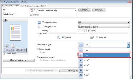 Pulse la lista desplegable <Perfil> → seleccione [2 pages/sheet (B&W)] → haga clic en [Aceptar].