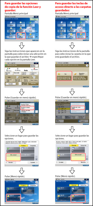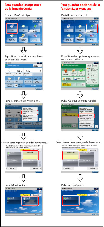 Puede leer información más detallada sobre cómo guardar opciones en los botones personales y los botones compartidos en "Guardar los botones personales y los botones compartidos", donde se emplea la función Leer y enviar como ejemplo.