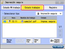 Muestra información detallada del trabajo seleccionado. Compruebe la información detallada → pulse [Aceptar] para volver a la pantalla Estado de trabajos o Estado Mi trabajo.