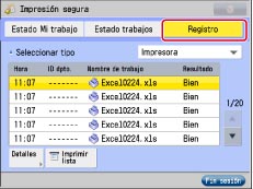 Si está desactivada la opción [Mostrar registro] en [Opciones de gestión] (Configuración), no aparece el registro de trabajos de cada pantalla.