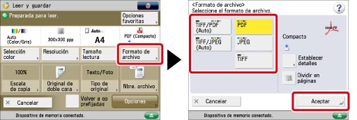 Guarda el archivo bien en formato TIFF (blanco y negro) o en PDF (escala de gris/color). Si selecciona este formato de archivo, aparece <TIFF/PDF> en la pantalla de lectura.