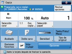 Aparecen los dos elementos para los que quedan menos páginas en la pantalla de funciones básicas de copia y en la pantalla Opciones de impresión. No obstante, si el número de impresiones restantes es el menor, sólo se muestra el número de impresiones restantes.