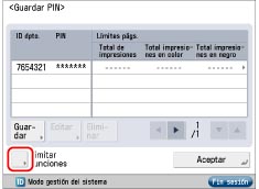 Puede especificar el límite de páginas entre 0 y 999.999. Una vez alcanzado un límite de páginas, no es posible copiar, leer, imprimir.