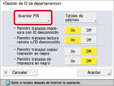 Si se activa la gestión de ID de departamentos a través del Lector de Tarjetas C1/Lector de Tarjetas de Copia F1, no es posible guardar o eliminar los ID de departamentos.