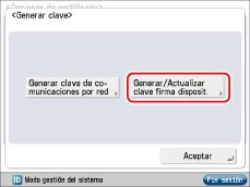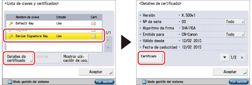 Para información acerca de cómo un usuario general puede comprobar el certificado de dispositivo, consulte "Comprobar un certificado de firma de dispositivo/firma de usuario".
