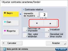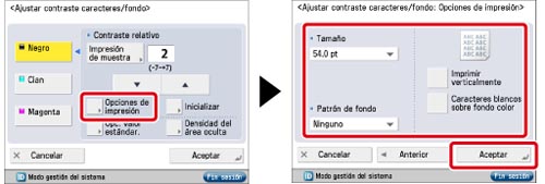 Si aumenta el valor de [Opc. valor estándar.], el fondo se oscurece, mientras que si reduce el valor, el fondo se hace más claro. Si selecciona [Caracteres blancos sobre fondo color] y aumenta el valor de [Opc. valor estándar.], el texto se oscurece, mientras que si reduce el valor, el texto se hace más claro.