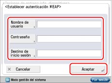 Nombre de usuario: Pulse [Nombre de usuario] → introduzca el nombre de usuario que se utilizará para la autenticación → pulse [Aceptar].