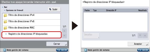 Se grabará un registro de bloqueo cuando las direcciones IP se han establecido de manera que se denega la transmisión y recepción de datos con el equipo, y se intenta la transmisión y recepción entre el equipo y los dispositivos con esas direcciones IP. El procedimiento para consultar el registro de bloqueo es el siguiente.