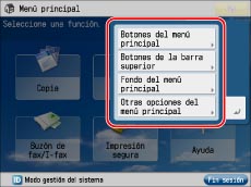 en la parte superior derecha de la pantalla, se muestra la siguiente pantalla. Seleccione las opciones en la pantalla mostrada y establezca la visualización de la pantalla Menú principal.