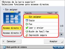 Si el número de botones de función supera el número de botones de la disposición especificada en <Botones del menú principal>, los botones sobrantes aparecen después de la página 2 de la pantalla Menú principal. En la pantalla Menú principal puede aparecer un máximo de nueve botones.