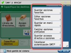 [Establecer autenticación SMTP] sólo aparece en la pantalla de función para [Leer y enviar]. Para más información acerca de la configuración de la autenticación SMTP, consulte "Usar autenticación SMTP para cada usuario".