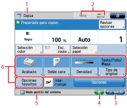 Aquí se muestra el progreso de los trabajos y las operaciones de copia, así como el estado de los dispositivos y consumibles. Además, según el servicio de inicio de sesión que esté utilizando, aquí puede aparecer el ID de departamentos o el nombre de usuario.