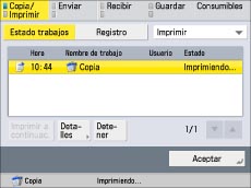 Para conocer las instrucciones acerca de cómo comprobar el estado de los trabajos de copia, fax y envío, consulte "Monitor estado/Cancelar".