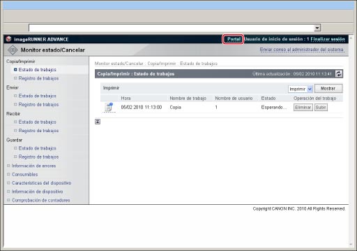 Muestra el estado actual de los trabajos y permite realizar cambios en los trabajos que están siendo procesados por el equipo. |