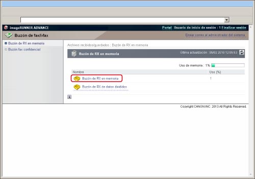 Pulse [Buzón de fax/I-fax] → [Buzón de RX en memoria] → haga clic en [Buzón de RX en memoria].