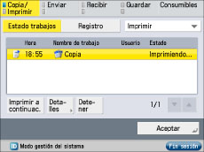 Si establece [Copia/Imprimir], [Estado de trabajos], [Imprimir] como Pantalla prefijada (Monitor estado/Cancelar):