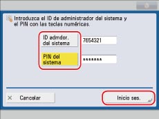 El administrador puede especificar todas las opciones del sistema del equipo. De forma predeterminada, las opciones de administrador del sistema (ID de admdor. del sistema/PIN del sistema) se establecen en el equipo. Por lo tanto, el administrador debe iniciar sesión introduciendo el ID de administrador del sistema y el PIN del sistema. La opción prefijada del ID de administrador del sistema y del PIN del sistema es '7654321'. Se recomienda cambiar tanto el ID del administrador del sistema como el PIN del sistema. (Consulte "Flujo de operaciones de la pantalla de configuración".) Para información acerca de las opciones que sólo puede establecer el administrador, consulte "Opciones de administrador".