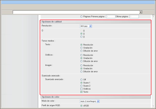 La configuración de [Graphics] y [Text] realizada desde la pantalla táctil sólo será efectiva si se ha establecido 'Printer Default' para 'Suavizado avanzado' en el controlador de impresora.
