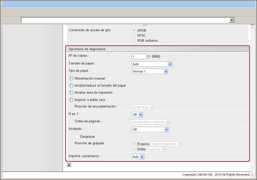 Esta opción especifica la definición del estándar industrial para los monitores para ordenador Windows genéricos. Si utiliza un monitor compatible con sRGB, puede imprimir los colores con tonalidades parecidas a las que aparecen en su monitor.