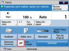 Si pulsa [Interrumpir], el trabajo actual no se detendrá inmediatamente. La impresión del trabajo en curso se detiene únicamente cuando realmente se inicia la impresión de la copia urgente o de interrupción.
