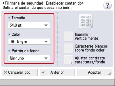 El texto que introduzca en [Person.] no se guarda automáticamente. Si desea registrar su filigrana de seguridad recién creada para seleccionarla cuando lo necesite, pulse [Guardar] → introduzca el texto que desee registrar.