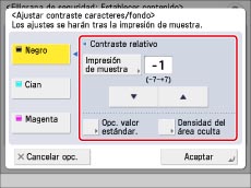 La opción [Ajustar contraste caracteres/fondo] se cancela cuando finaliza el trabajo. Si desea utilizar las mismas opciones para el siguiente trabajo de copia, vuelva a especificar la configuración.