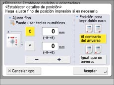 Si establece dos de los modos Numerar páginas, Numerar juegos cop. o Imprimir fecha para imprimir en la misma posición, aparece un mensaje de confirmación al pulsar