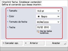 Si no especifica una fecha, se imprime la fecha de [Ajustes de fecha/hora]. Confirme que son correctas las opciones de fecha y hora. (Consulte "Fecha y hora actuales".)