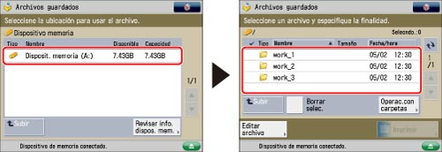 Seleccione el dispositivo de memoria que desee → seleccione la ubicación en la que está guardado el archivo que desee imprimir.