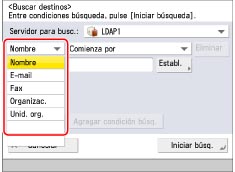 Si se han guardado varios servidores LDAP y se ha activado [Búsqueda automática al usar servidor LDAP] en [Establecer destino] (Configuración), se busca el primer servidor guardado que se muestra en la lista desplegable.