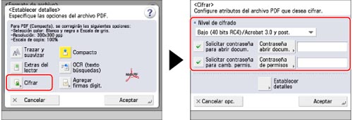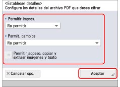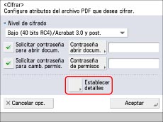 Si deja vacíos los campos [Contrsñ. para abrir un doc.] o [Contraseña de permisos], se borrará la contraseña existente.
