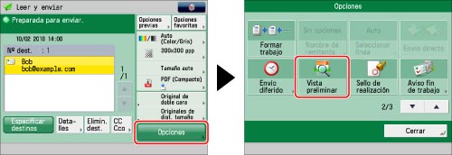Especifique el destino → pulse [Opciones] → [Vista preliminar].