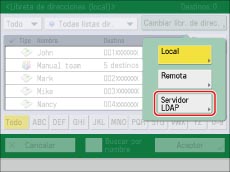 [Cambiar libr. de direc.] aparece solamente cuando están guardados tanto la libreta de direcciones remota como el servidor LDAP. Si solo está guardada la libreta del servidor LDAP en este equipo, aparecerá la opción [A servidor LDAP].