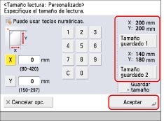 Si desea leer originales mayores que los tamaños estándar, pulse [Original largo]. La longitud máxima de los originales que se puede leer es 630 mm. La longitud de los originales de tamaño estándar es la siguiente: