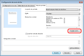 Haga clic en [Configuración] para especificar los elementos que se deben incluir en la portada.