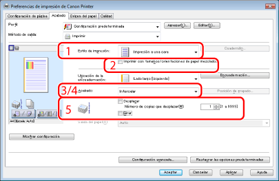 Para conocer las instrucciones acerca de cómo mostrar la pantalla del controlador de impresora, consulte "Impresión" o "Configurar las opciones de impresión prefijadas".